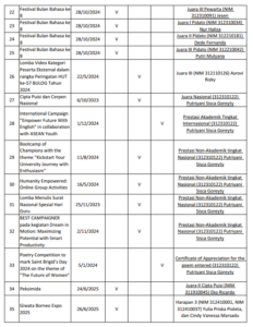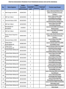 Data prestasi mahasiswa Program Studi Pendidikan Bahasa dan Sastra Indonesia menunjukkan capaian yang membanggakan melalui keberhasilan mahasiswa dalam meraih berbagai penghargaan pada ajang lomba di tingkat wilayah hingga tingkat nasional. Prestasi tersebut mencakup bidang akademik maupun nonakademik, yang mencerminkan kompetensi, kreativitas, serta daya saing mahasiswa. Capaian ini menjadi indikator komitmen program studi dalam mendukung pengembangan potensi mahasiswa secara berkelanjutan serta membangun budaya prestasi di lingkungan akademik.